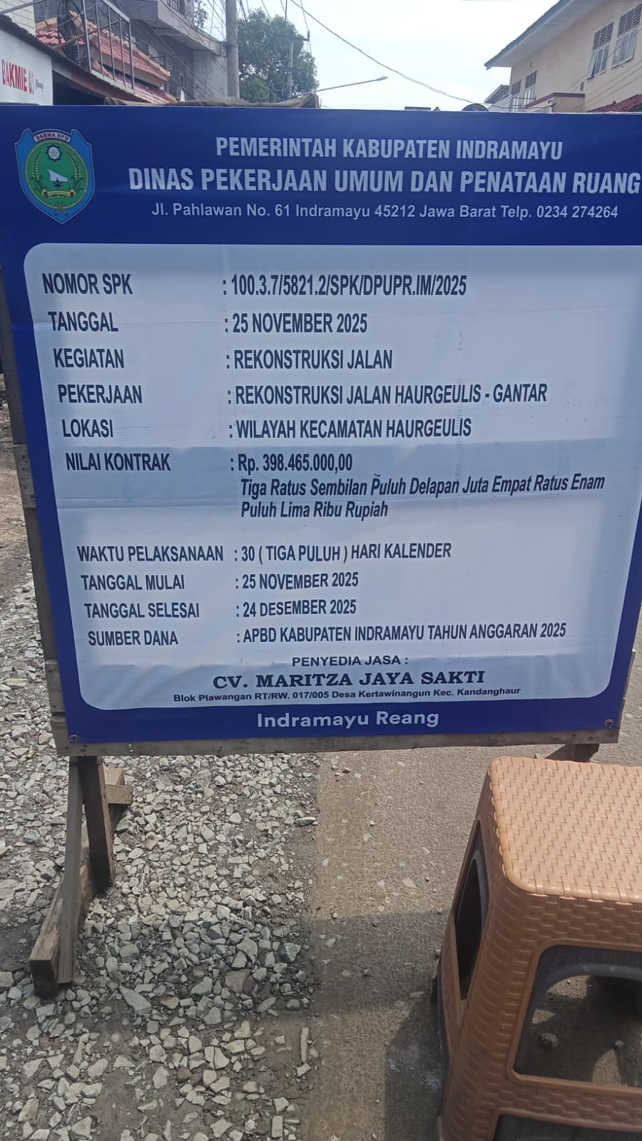 Pemerintah Kabupaten (Pemkab) Indramayu melalui Dinas Pekerjaan Umum dan Penataan Ruang (DPUPR) telah mengeluarkan Surat Perintah Kerja (SPK) Nomor 100.3.7/5821.2/SPK/DPUPR.IM/2025 untuk kegiatan rekonstruksi jalan Haurgeulis-Gantar di Kecamatan Haurgeulis. Proyek ini dianggarkan dengan nilai kontrak Rp 398.465.000,- dan berjalan selama 30 hari kalender, mulai 25 November 2025 hingga 24 Desember 2025, dengan penyedia jasa CV. Maritza Jaya Sakti.